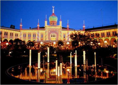 这里的水景令人叹为观止,水面上不仅有雕塑、喷泉,还有花舟游弋,水鸟翻飞。当夜幕降临,园内灯光灿烂、闪烁生辉。整个游乐园既象是在黑幕上画出一幅大笔素描,又似是一个玻璃的世界。树枝上的彩灯大小不一、明暗有致,衬托出通幽曲径、树影婆娑。水边的灯饰图案各有不同,色彩各异,在不同的水面上经过巧妙的安排和艺术的穿插,有如镜花水月,给人以朦胧迷幻之感。
