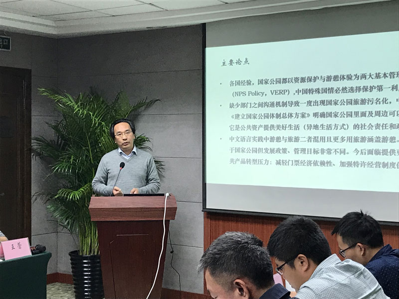 2017年11月28日,由北京师范大学和世界自然基金会(瑞士)北京代表处联合主办的“国家公园项目成果交流和国家公园试点进程分享会”在京师大厦举行,北京大学城环学院旅游研究与规划中心主任吴必虎教授受邀出席了此次会议,并发表题为《中国国家公园:由旅游向游憩转型我们准备好了吗?》的演讲。