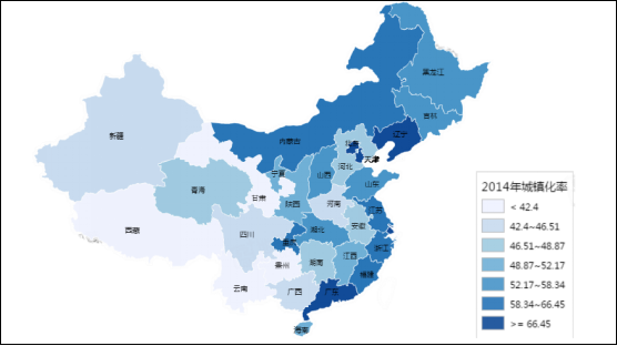 图2:城镇化率不均衡分布:沿海高度城市化(2014)