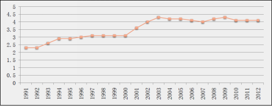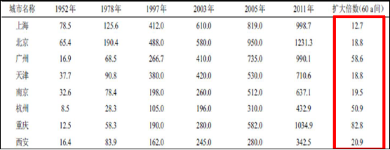 表1:中国若干特大城市用地(建成区)面积(Km2)及扩展情况(1952-2011年)