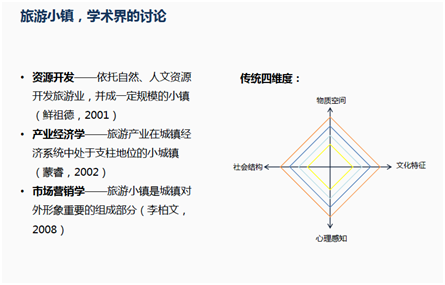 旅游小镇,从学术的讨论、研究来讲,有很多人给旅游小镇下过定义。但是什么叫旅游小镇,依然有不同的说法,我们可以归纳为四个传统维度去观察。