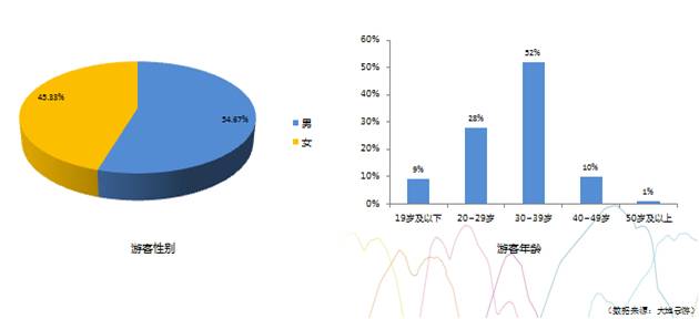 从游客属性上来看,铜仁市游客中,男性游客占比较高,高出女性游客9个百分点,且游客主要以30-39岁为主,占比52%,其次是20-29岁,占比28%。