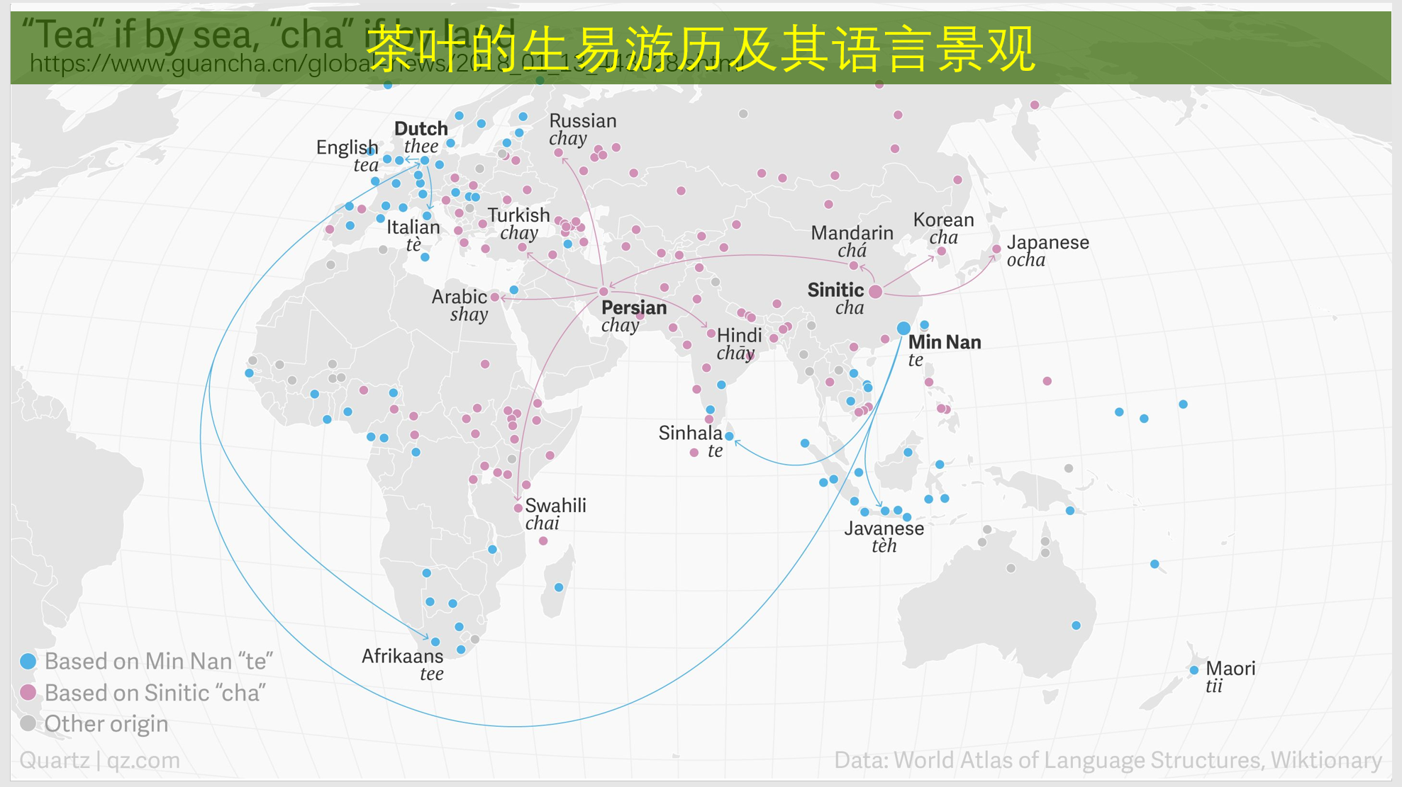 第二种状态叫生易,为了生存、生产、生活需要长距离的交易,但我们每天到楼下超市和小市场这都不叫生易。古代形成的丝绸之路、茶叶之路、陶瓷之路,大部分是贸易的需求。茶叶,大家知道丝绸之路大部分时间运的是茶叶,通过海路运的都是闽南话,闽南话讲茶就是Tea,通过陆路或者通过东北亚运的叫茶,日语就叫做お茶。沿着万里茶道从俄罗斯、北欧、东欧这些地方运的叫茶。所以红颜色叫茶,绿色叫Tea。