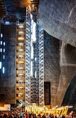 游客可以选择两种方式到达地底——乘坐垂直电梯一路向下,或者步行通过13层杉木制成的楼梯。不论哪一种方式,下降的沿途,游客都可以从不同角度欣赏到这个盐矿深坑的宏伟非凡和瑰丽的地质景观细节。