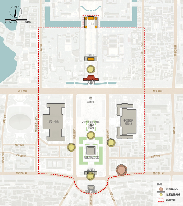 在旅游服务提升方面,方案分别以“智慧天安门、人本天安门、人文天安门、人和天安门”为命题,重点构建智能化旅游信息系统、人本化旅游设施系统、主题化广场景观系统和仪式化游赏组织系统,形成“一主三辅”四大旅游服务体系,全面提升天安门地区旅游服务品质。其中,“智慧天安门”智能化旅游信息系统,首次提出将GIS、无线网络等现代信息技术运用到天安门地区的旅游信息发布、游客管理、环境监控、安全管理等各个方面,构建面向游客和管理者的双向信息服务体系,从而实现天安门地区游赏服务和旅游管理的智能化,最大限度地解决由于天安门地区多头管理并存、游客规模庞大、管理任务繁重、信息渠道不畅、游赏便捷性不足等带来的诸多问题,形成了整个方案的创新亮点。在构建“一主三辅”四大旅游系统的基础上,远期还将实施“前门-广场—故宫无障碍步行廊道打造工程、环广场特色旅游交通系统构建工程、广场东南片区旅游特色街区改造工程、广场休闲绿地拓展工程、广场地下旅游服务空间开发工程“五大远期项目,将天安门广场打造成为人民的广场、时代的广场、休闲的广场和绿色的广场。