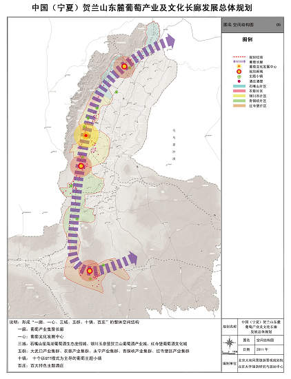 作为自治区发展新型农业的龙头,规划主要围绕贺兰山东麓土地、光照等自然资源优势和沿线丰富的旅游资源优势,构建了“以葡萄产业为基础,以葡萄产业与旅游产业高度结合为特色的全产业链”的区域发展模式。规划树立了 “一十百千万”产业目标体系,即在空间上形成一条全球知名的葡萄产业经济带及葡萄文化长廊、十个葡萄特色小镇、百大特色酒庄、千亿区域综合产值的规模,解决数十万人口就业的发展体系。