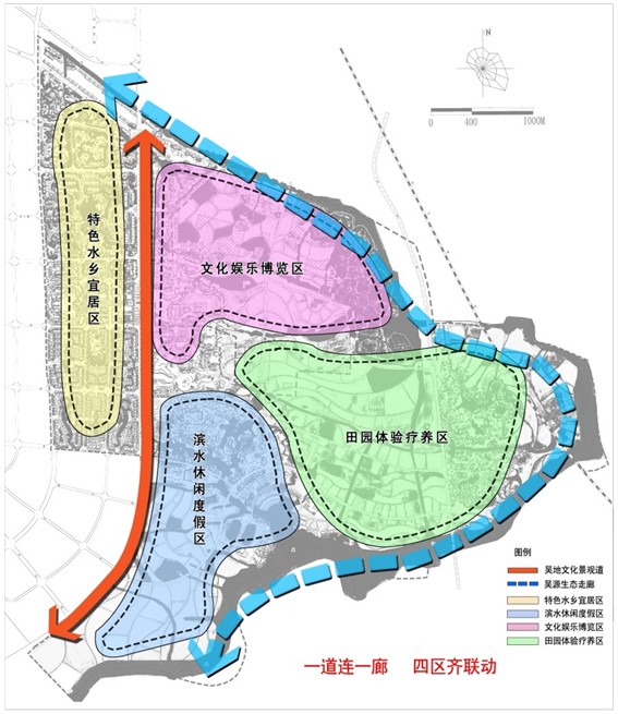 利用项目区块作为吴文化发源地的历史背景作为依托,以水乡、田园、湿地、博物馆等资源为基底,以古代——现代——未来的历史发展为时间脉络,引入现代的休闲娱乐产品,重点展现吴地的地域文化、水乡生态文化、商贸文化、士文化和创世文化,通过展览、休闲、娱乐、宜居、康体、疗养、商贸等多元形式,发展文化休闲娱乐产业、绿色健康产业、度假地产业、生态农业产业、会议会展业,打造我国唯一的由古代盛世吴地文化至未来江南文化的综合体验功能地块。