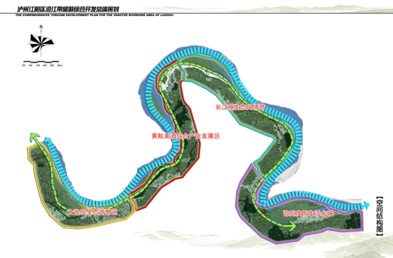 本项目通过对沿江带区位分析、场地分析、旅游市场分析、相关案例分析基础上,将项目定位为:长江美酒湾旅游度假区——以旅游为导向的沿江综合经济产业带。并提出“城—乡—城”、TOLD模型、精品塑造、文化活化、分步实施、经济性发展以及可持续发展七大战略。在此基础上提出“两廊四段”即:四万米亚热带水果风情廊道和长江百里画廊以及大张坝生态游憩区、黄舣美酒综合产业发展区、长江原生态风情带和弥陀度假生活乡城四大功能分区。