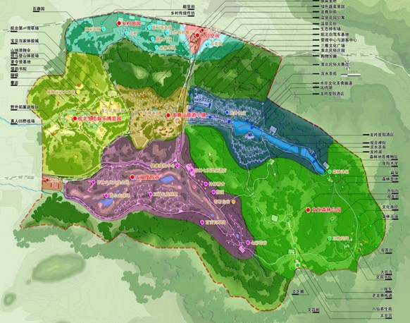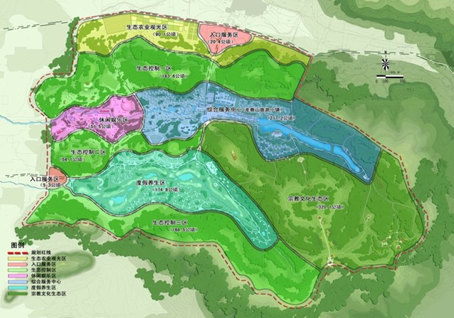 根据项目区块的地形、市场需求等,形成“一心三谷三带、东游西闲、北低南高”的空间布局战略和宗教文化生态区、综合服务中心区、休闲娱乐区、生态农业观光区、度假养生区、生态控制区、入口区等七个功能分区。