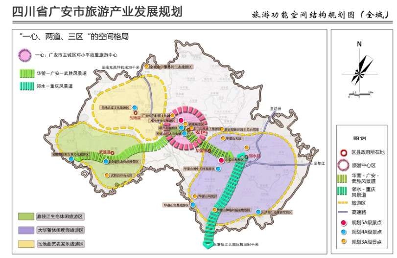 规划将广安现有的红色旅游一枝独秀,转化为红绿金古四色旅游齐头并进的产品格局,实施红色旅游升华创新扩容、绿色生态休闲旅游深度开发,金色商务会议度假旅游跨越式提升、古色古镇文化度假旅游特色化发展的后观光时代的旅游产品新格局。
