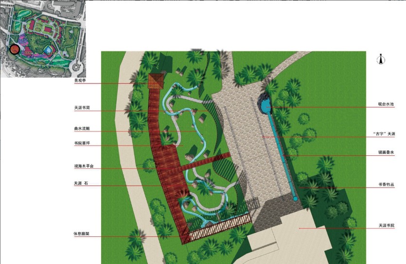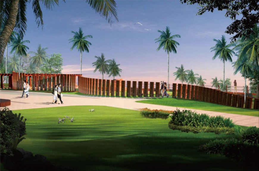 在“尊重、亲近、生态、均衡、健康”的规划理念指导下,坚持“做减法”、以整改为主、体现“天涯”风格的设计原则,分别从景观结构、景观分区、道路交通、游线组织、基础设施、绿化种植、夜景照明等方面,全面而深入的提升天涯海角景区总体旅游服务质量。在总体布局上,注重空间的协调联系与集中整合,形成中心突出的整体景观形象,全区域的观景、休息、交通的组织以及多样化的景观边界处理,形式因地制宜。规划将整个景区划分为五个区块,采用“一轴、一带、多节点”的景观结构,合理规划道路交通系统,设计和组织景区的游览线路。景观分区:出入口景观区——景区的入口是游客对景区的第一印象,梳理目前杂乱的交通流线,在游客服务中心和票房周边进行小园林的设计,增加亲切感;天涯意象区——景区景观主轴及其附属景观,以水景贯通,打造意象天涯的主体景观;天涯风情区——景区东部的观光片区,以热带植被和建筑小品为主体,打造“天涯情”的游憩体验区;天涯文化区——以天涯书院为主体,形成继承和研究“天涯文化”激发游客对天涯文化的体验和感悟的场所;天涯核心景域——以天涯海角石、南天一柱、海判南天以及热带雨林等自然风貌景观为主体的景区核心景观。