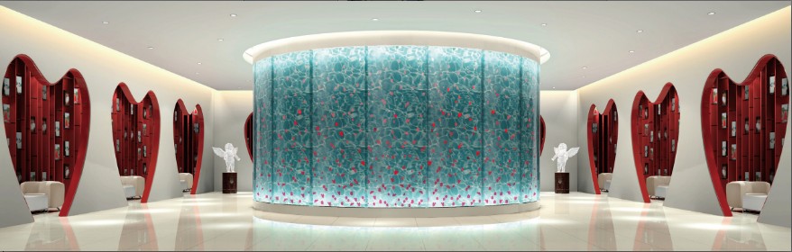 本项目亮点有二:其一,一层室内心型茶厅,设计藏放新婚夫妇爱情感言书的别致书柜和室内中心的爱情花瓣墙,整个大厅体现出爱情的晶莹剔透和美轮美奂。其二,二层新人典礼大厅,“山盟海誓”的设计构想是整个项目的经典一笔。加之装修无断结,铺装材料光滑剔透,整个空间仿佛是完整的水晶,反射着爱情、映透着人生。