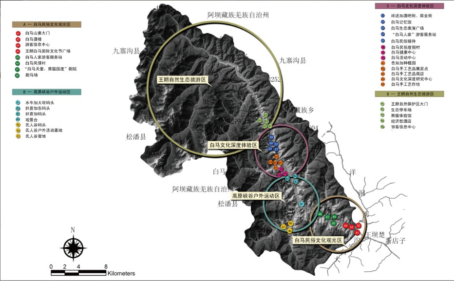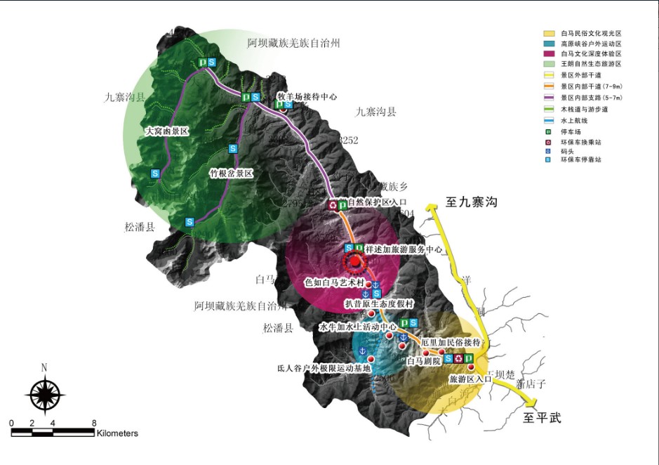 规划通过对旅游区场地条件的GIS 分析,研究区域空间发展潜力,优化旅游区空间结构,在旅游区形成“一心两廊四区多节点”的总体空间发展格局:一心即详述加旅游服务中心,为整个旅游区提供综合性服务;两廊为贯穿白马社区的文化廊道以及王朗自然保护区的生态廊道,让游客在行车(船)过程中充分感受到原始、质朴的自然与文化气息;四区为白马民俗文化观光区、高原峡谷户外活动区、白马文化深度体验区、王朗自然生态旅游区。