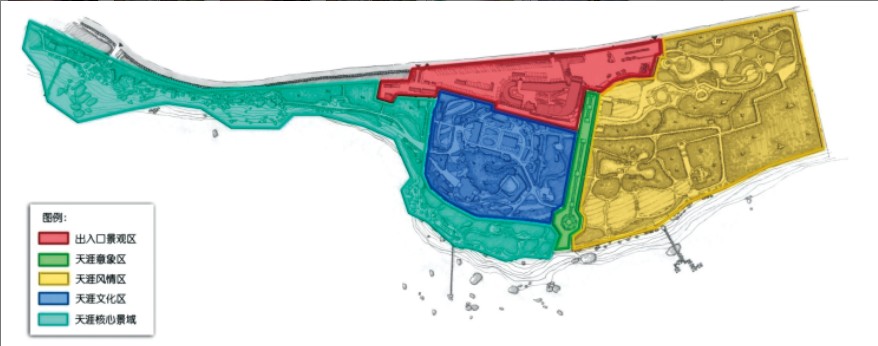 天涯海角景区位于距三亚市区约23 公里的天涯镇马岭山脚下,前海后山,风景独特,是国家AAAA 级景区。“天涯海角”作为中国陆地最南端的极地景观和意象的结合,衍生出丰富的爱情文化、思乡文化、流放文化、极限情结等文化内涵,自然景观与人文情感的互动与共鸣,形成了天涯海角的独特魅力。但随着三亚旅游业的发展,老牌的天涯海角景区受到了一定的挑战,景区发展出现许多问题。目前景区核心的天涯文化旅游产品仅集中在奇石和摩崖上,产品老化现象严重,新增项目和景观节点的文化挖掘不够,景观设计粗糙而缺乏特色,对景区主题造成一定干扰,影响了游客体验。规划指出,天涯文化有着丰富的内涵,通过发展定位、景观设计和项目策划充分凸显天涯文化元素,对游客进行“寻情”的心理暗示,是景区发展的突破点。为此,规划提出了景区发展的景观移情战略,即围绕“天涯文化”这一核心,从文化和自然中提取“天涯”元素,通过典型景观的梳理和改造,还原和凸显“天涯”的方位、生态、历史、艺术和情结,通过景观所传达出的自然元素和文化符号,让游客在不同的情境中感受和体验“天涯”,使天涯海角游览区真正成为人们寄托情感的场所。规划根据景区资源分布和游客的不同体验,将景区主体分为四大主题功能区:意象天涯区、寄情天涯区、感悟天涯区、栖居天涯区;并对各大主题区的产品开发、活动策划和景观设计进行详细阐述。规划还提出在景区打造“天涯十景”(日月奇石、南天一柱、海判南天、“天涯海角”、天涯文化走廊、天涯情路、天涯部落、天涯书苑、天涯醉晚亭、花映天涯),作为景区的重要的观光节点,起到景观引领的作用。