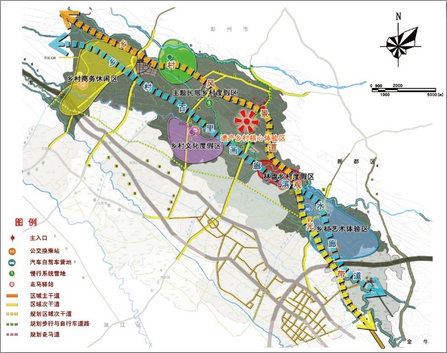 通过对乡村性评价,风景道评价等技术手段对度假区资源进行科学评估,确定将度假区建设成为最具川蜀文化与川西乡村景观特色的中国式遗产乡村度假地,并且开创性划破行政区域的界限,建设五个以乡村性为核心的产品功能组团,构造出度假区内动静游憩曲线、丰富的EHA 度假生活、亲疏有致的游憩组团以及持续不断的节庆活动。方案受到甲方的一致好评,认为规划为郫县描绘了一幅非常美妙的彩图,并且按照规划方案立即开始招商引资。