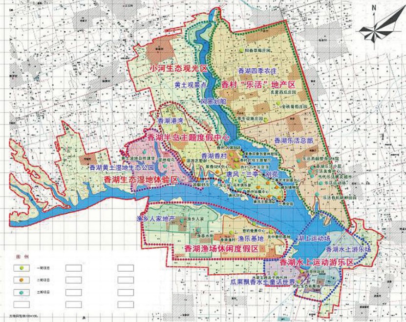 规划采取“一心五区”的空间布局——香湖半岛主题度假中心、香湖“乐活”地产区、香湖渔场休闲度假区、香湖水上运动游乐区、小河生态观光区、香湖生态湿地体验区,并从主题度假、创意体验和滨水娱乐三大产品系列描绘香湖旅游生活,再加上多入口多方式的交通组织和极富游憩体验的接待设施安排,将关中香湖打造成名副其实的度假天堂。