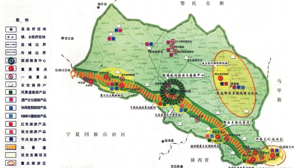 鄂托克前旗旅游资源丰富、城市化建设缓慢、人工雕饰较少,是一个颇具自然地理环境和生态多样性的地区,也是全国少数民族文化保存最为完好的地区之一。本规划以建设“本色鄂尔多斯”为总指导思想,重点发展鄂尔多斯风景道、遗产文化、休闲度假、特种旅游四大品牌产品,旅游空间结构可概括为:“一道一心一区多点”。