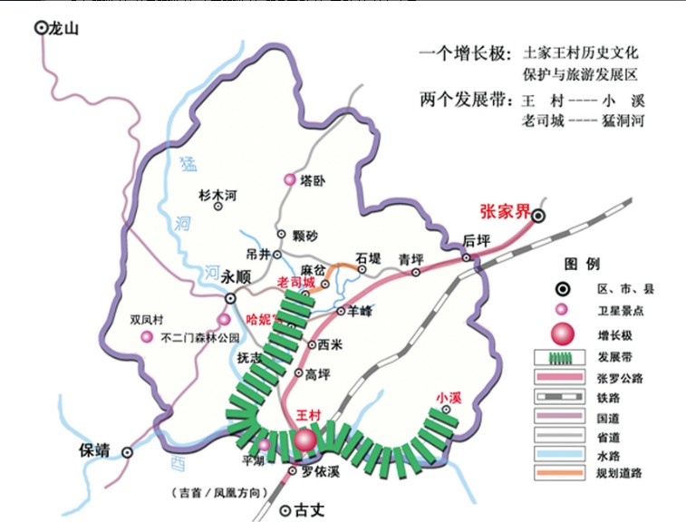 区际间旅游要素赋存的不同,必然导致区际间旅游经济活动方式和内容的不同,永顺所处的地理位置和经济区位,决定了制定规划必须把永顺旅游发展放到整个大湘西的宏观格局中来综合考虑。针对这一情况,本规划提出了以“大湘西一体化区域竞合”为总的指导思想,以“深度挖掘土家族文化,重点发展古镇遗产休闲游、古遗址怀旧游、绿色生态休闲游和猛洞河漂流等品牌旅游产品,塑造推广‘中国土家源·湘西王村’的旅游形象”为总体发展思路,优化旅游产品和产业结构,全面提升旅游竞争力,把旅游业发展成为永顺县国民经济的第一大产业,将永顺县建设成为大湘西旅游目的地群的重要组成部分和国内外著名的旅游地的总体战略。