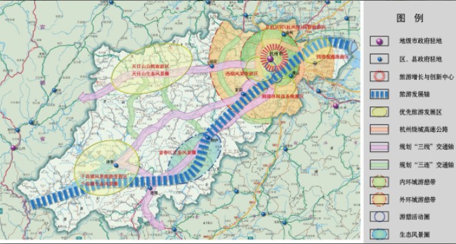 京杭运河:面向国际市场的世界旅游精品杭州因湖而名,因河而兴。对于国际游客而言,西湖的文化意蕴难以阅读和领会,而大运河却是世界知名的中国古代奇迹。因此为了将杭州旅游推向世界,规划提出主打“运河牌”,打造以运河为中心的世界级旅游精品项目。规划将杭州运河产品的主题设计为“过去、现在、未来”,提出了“三中心、四区段、十五节点”的空间结构布局,在杭州市域内构建一条“运河文化带”,使之成为贯穿杭州时间与空间发展的历史文化脉络。目前,规划策划的运河沿线节点,如小河直街、拱宸桥、“天下粮仓”富义仓遗址、LOFT 文化公园、京杭大运河博物馆等都已整治一新,三条运河水上旅游线正式开通,杭州朝以江、湖、河、海、溪“五水共导”的“东方威尼斯”迈出了坚定的一步。