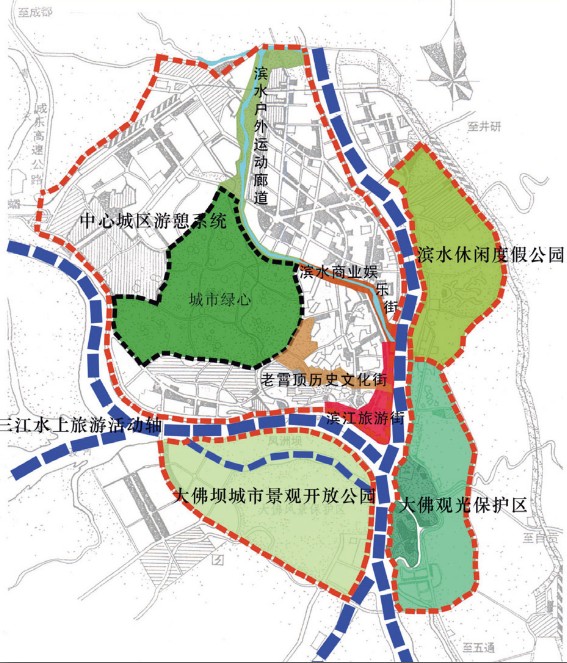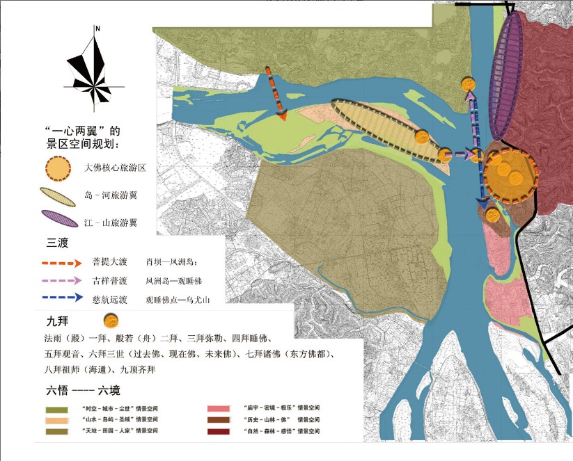 规划面向“山城”、“佛城”一体化的目标,从大尺度出发,将大景区整合为点线面结合的时空统一体,打造城市之外的净土。规划确定的大景区空间结构为“一心两翼六境”,其中一心为大佛核心旅游区;两翼为岛—河旅游翼和江—山旅游翼;六境分别为“尘世、圣域、人家、极乐、大佛、感悟”六大情景空间。
