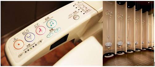 2、个人化的隐私空间。尤其是女厕所,一般都有较广阔的空间,女性可以在那里休息、化妆,有的还备有化妆水等。而且为了防止排尿的声音泄露出来使人害羞,还专门设计了叫做“音姬”混音装置,这是除日本以外世界任何地方都没有的装置。这种装置开始时使用古典音乐或鸟鸣的声音掩盖排尿的声音,后来觉得这些声音还是不自然,因此现在通常使用流水的声音。据说这种装置是受江户时代厕所里具有同样功能的装置的启发设计而成的,那时不是水洗厕所,因此此类装置安装在便坑里面。