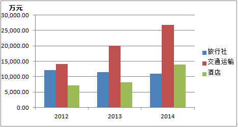 2012年公司通过发行股票购买资产的方式取得世博出租车、云旅汽车、世博花园酒店及云旅酒店管理公司的100%控股权,2013年又实现了对丽江国旅的收购。在多元经营战略的指导下,集团不断拓展新业务,创造新的盈利点,旅行社、酒店、交通运输三大业务的发展进一步优化了公司收入结构的配比,与旅游业务相关的交通、酒店、旅行社、景区等业务占到公司总营业收入的60%以上。2012-2014年之间,除了旅行社业受到国家宏观政策的影响营业收入有所下滑,交通和酒店业务都呈现稳定增长。