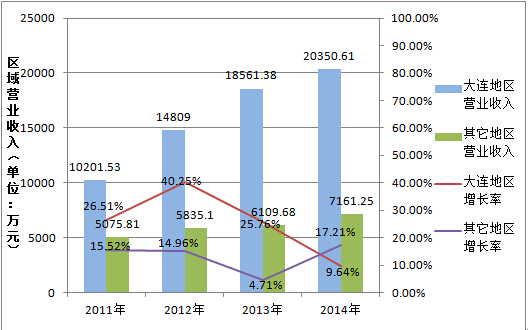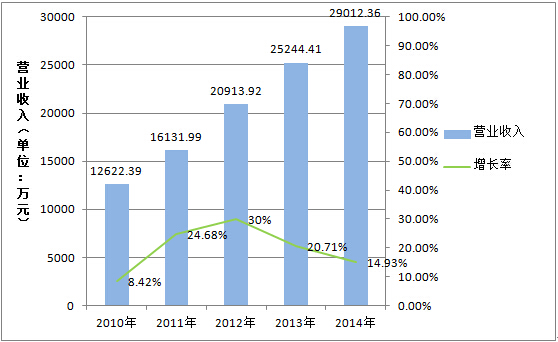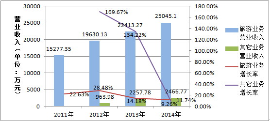 在该战略的指导下,大连圣亚立足自身在海洋动物孵化方面的技术优势和海洋动物表演方面的产业优势,以海洋和极地两大文化旅游品牌的打造为引领,积极构建与相关领域上下游企业之间的合作平台,以丰富文化元素的注入和重组,不断丰富核心产品的表现形式,提升品牌的竞争力与市场吸引力。从2010年到2014年之间,大连圣亚一直处于稳定的发展增长期,年均营业总收入增长率保持在20%左右。