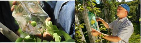 梨树花期结束10天后,将细瓶颈的大肚酒瓶,套在梨上。梨采摘后,往瓶内灌装上好的韩国清酒,浸泡90天后就生产出“酒瓶梨”。由于密封程度好,其成熟期一般比普通梨要提前5天。而且,由于从刚“出生”开始就“躲”进了瓶子里,完全隔断了农药及外部不利环境的影响,经有关部门检测,“酒瓶梨”的农药残留量为零。由于“酒瓶梨”的独特种植创意,已经作为韩国农产品代表参展多个国家的“食博会”。