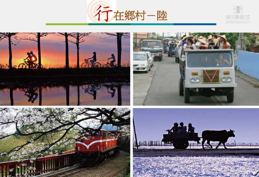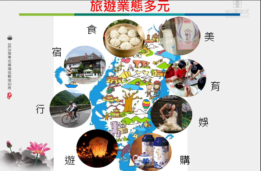 台湾的乡村旅游,有各式各样的业态,包括食、宿、行、游、购、娱、育、美等多元业态,以下逐一跟大家分享,如何发展這些多元业态的乡村旅游。