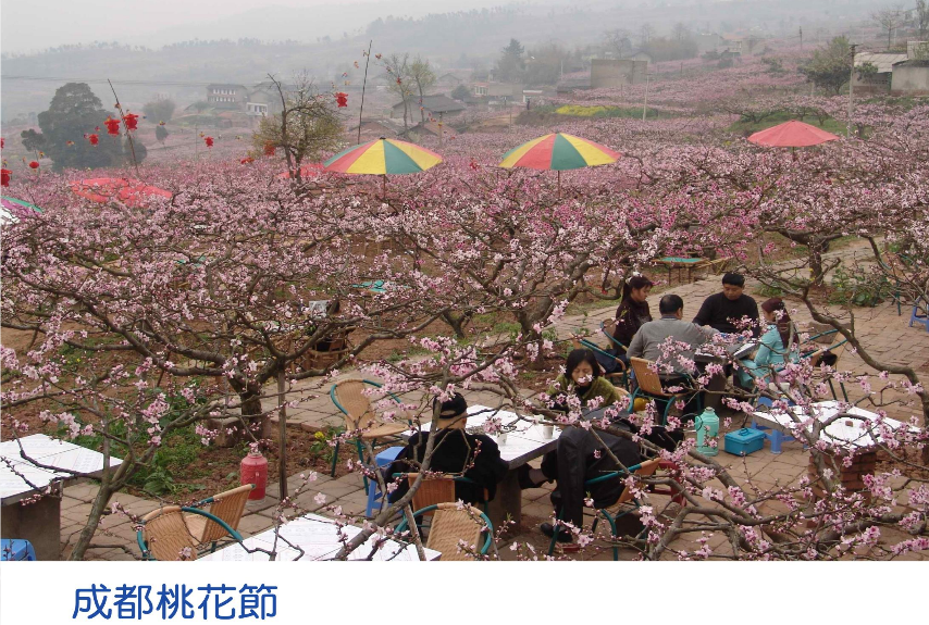2005年,四川成都舉辦首屆國際桃花節,万亩桃花盛开的时候,在桃花树下,農家提供打麻将的活動,附贈中餐、晚餐及茶水服務,非常受到成都人的喜愛。另一個生態旅遊的經典案例,就是山猪岛,这个旅遊產品是无意中发现,在台灣南部,有一个水库叫曾文水庫,像浙江千岛湖一样,原来水庫底下是有個村落,水库淹没區,居民搬他處,但是部分村民忘记將猪也一起搬遷。几年之后,猪只在这个孤岛繁延下来、由几只猪繁延成群,到现在已有上百猪只,而且不同猪群有不同的花色。几年前,曾文水库湖面开始发展旅游,有一天,船长开到距离孤岛不远处,不小心按了喇叭,孤岛上发现远处山猪狂奔而来,船长把船开到岸边一看,才发现原来是好几群的山猪,于是开始展开山猪的喂食活动,人和山猪,开始有了互动与约定,每次旅游船快到山猪岛时,船长就按喇叭,山猪闻声狂奔而来,渐渐地就形成了山猪岛的生态旅游产品。这是不用花钱的营造,只是花心思把这项产品挖掘出来。
