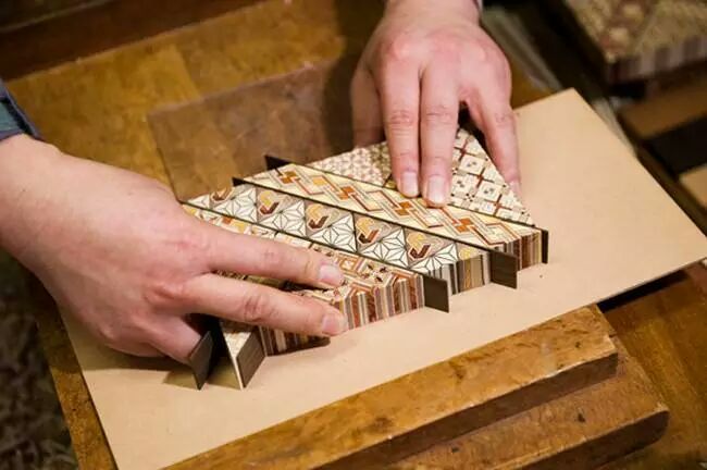 除了贴纸的作品,寄木细工当然还有实木作品。目前,寄木细工的成品主要有信匣、宝石匣、杯垫、托盘等。其中最为有名的要数密码箱。由于设有保密设置,要打开箱子,必须懂得开启方法,它是箱根旅游业的知名纪念品。做为寄木细工工艺的代表作品,秘密箱始创于1830年左右。箱体被设置了密码,如果不懂得开启的方法,是无法打开箱子的。开启的步骤分为4次、7次、10次、12次等种类,还有开启步骤125次的秘密箱。秘密箱的侧边设置有暗道,侧边的木片需沿着暗道顺序移动,才可以打开箱子。木片移动的次数越多难度越大,移动次数少的有4次,多的可达到几十次,甚至上百次。可以说,寄木细工中的秘密箱作品简直把匠人精神发挥到了极致!