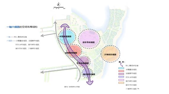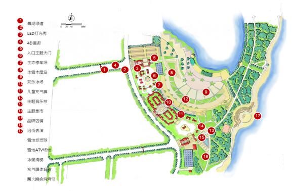 以一条创意景观轴串联六个组团,形成共生相联、各具特色的组团系统。一轴即核心景观体验轴,六组团包括冰雪童话组团、主题集市组团、欢乐冰场组团、室内娱乐组团、音乐节庆组团、沙滩娱乐组团。