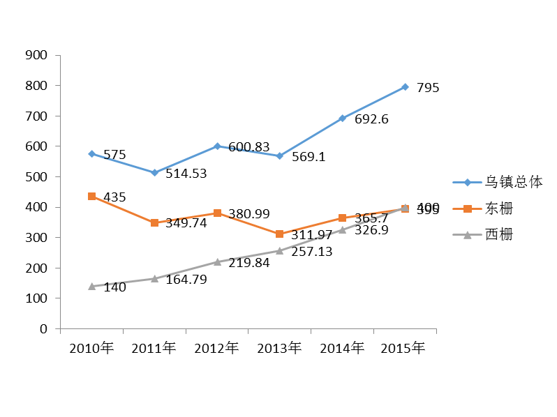 从上图中可以看出,乌镇景区持续呈现快速增长趋势,尤为突出的是西栅景区人数增长明显,2015年游客量达400万人次,比2010年增长286%,并且首次超过东栅景区游客量;