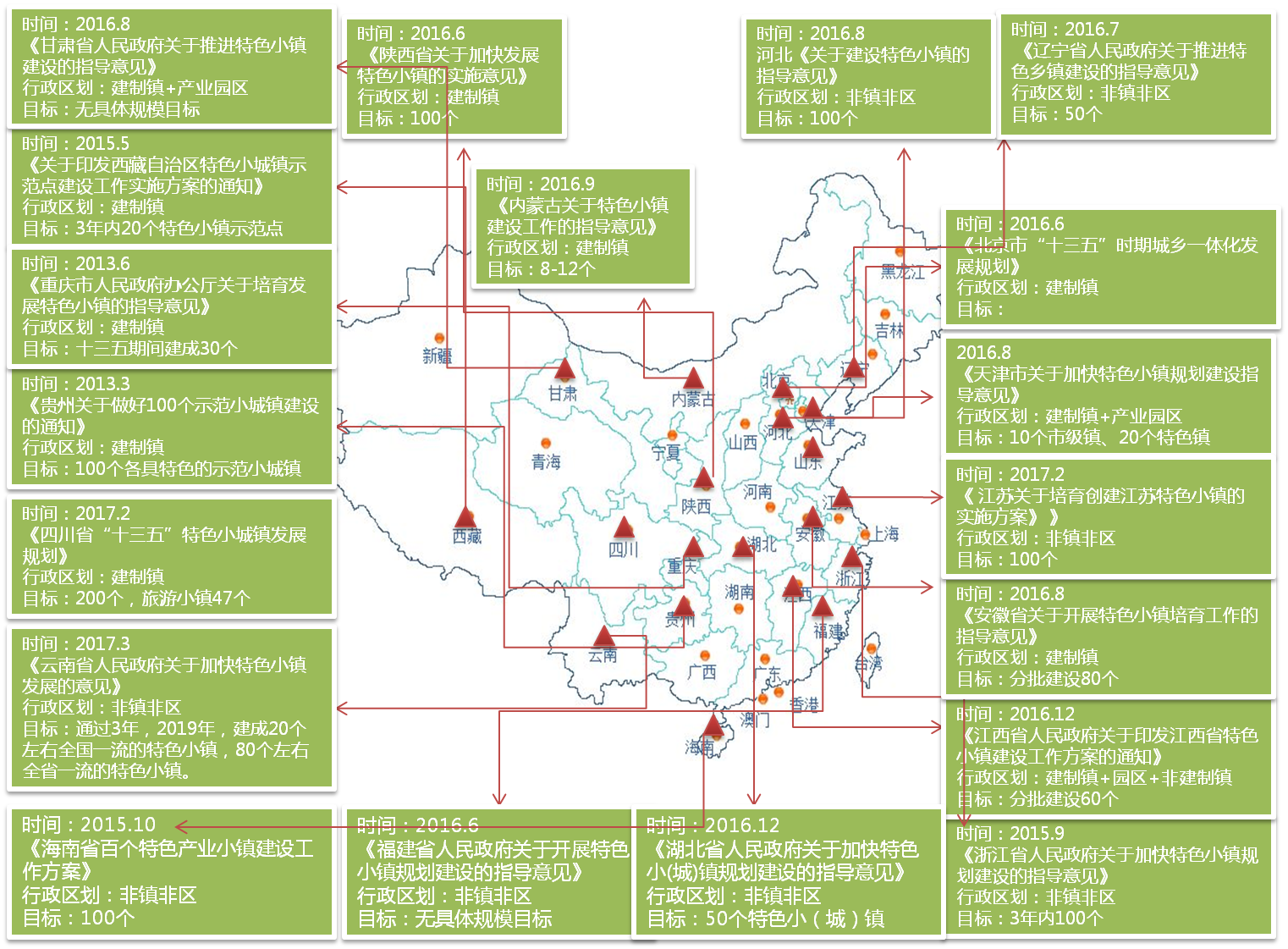 2016年1月:中共中央、国务院发布《关于落实发展新理念加快农业现代化实现全面小康目标的若干意见》(一号文件),提出加强乡村生态环境和文化遗存保护,发展具有历史记忆、地域特点、民族风情的特色小镇,建设一村一品、一村一景、一村一韵的魅力村庄。