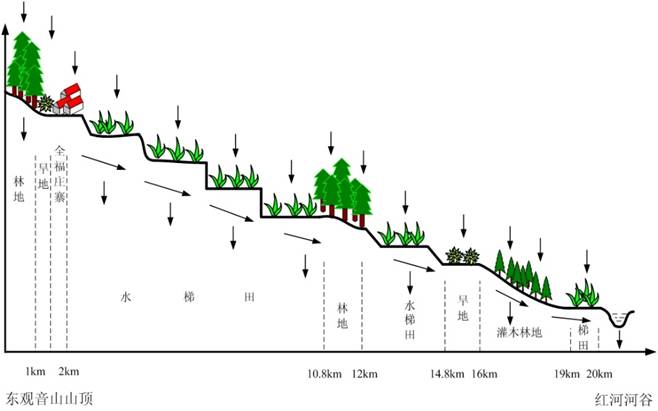 哈尼人对水资源的认识和管理是非常智慧的。有个人在高山上绕了半天最后跑来问我,“山上没有水库,这个水是怎么上去的?”我说:“水从天上来,云雾就是我们的空中大海,森林就是我们的绿色水库。”一年一度的印度洋、南太平洋季风性气候带来的雨水储存在在绿色的水库里面,渗透到地下看不见的水库砂石层里面,水就慢慢流下来,被聪明的哈尼人截流,开挖水渠、通过大沟、小沟再灌溉到梯田里面。流到低海拔的水受热变水蒸气蒸腾到高空,又被冷空气截流,变成雨水降到森林里。如此循环反复。哈尼人很好地利用了这个自然生态循环,变为农业生态循环系统。