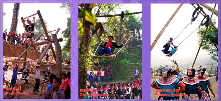 插完秧后,会过六月节,六月节会打秋千,转转秋,要有勇敢的人才能上这个秋千,这是一个放松的节日。一种说法是,大家累了需要休息,另一个是传说,农耕的时候,小动物受伤了,他们跑到天神那里去告状,天神说他们也是迫不得已,不过我会惩罚他们的,但是到了日子,天神偏袒哈尼人,就告诉大家,你们要叫“哎哟哎哟”,要杀牛留血,于是留下来了“杀牛、祭天、打秋秋”的说法。实际上这是一个祈祷丰收、“愚人愚神”的节日。