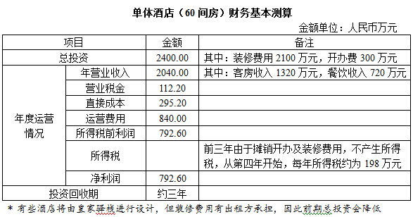 皇家驿栈总投资2400万,除去一系列费用后,所得毛利润是792.6万,基本三年就收回了所有的投资,这在酒店业界是比较高的利润。