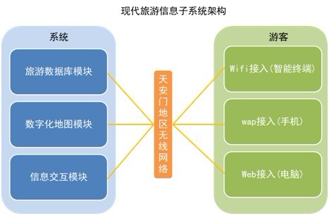 游客可使用具有无线上网功能的智能手机、上网本、平板电脑、笔记本电脑等智能终端连接系统,也可通过手机浏览wap网站的方式连接系统,也可以通过普通电脑访问web网站,还可在游客中心通过触摸屏接入。