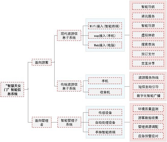 “智慧天安门”智能化旅游信息系统,不仅注重各种高端信息技术在旅游信息服务中的运用,同时也将突破单一面向游客的常规旅游信息服务模式,同时兼顾游客游赏需要和管理者管理需求,构建面向不同类型游客和天安门地区管理者的智能信息服务体系,全面实现天安门旅游游赏服务和旅游管理的智能化。