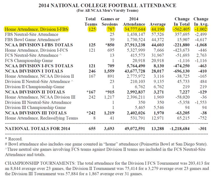 橄榄球赛分甲、乙、丙## (division I, division II, and division III)举行,最高级的甲级比赛在名校之间进行。甲级比赛共有125个队,一共进行787场球赛,2014年观众人数超过3477万人,平均每场观众44190人。甲乙丙三组级比赛,一共655个队,3693场球赛,有超过4907万人观看,平均每场观众13288人。橄榄球赛的每场观众人数,是橄榄球比赛观光业的重要参考指标。