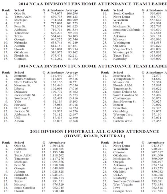 在美国的各个大学橄榄球队中,2014年俄亥俄大学橄榄球队比赛赢得了最多的观众人数,每场达106296人。另外有五所大学的球队,平均每场也获得了超过10万观众。