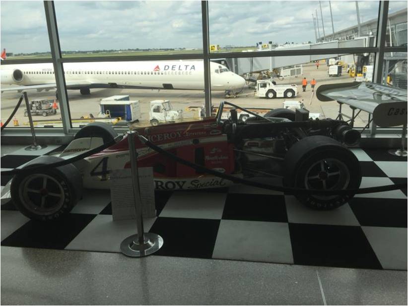 印第安纳州波利斯机场在机场的乘客候机区域展出赛车实物。图中这些赛车都是七十年代的古董级赛车。