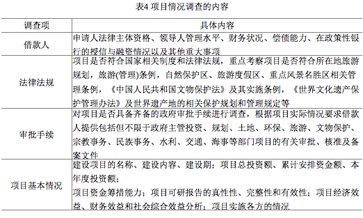 调查项具体内容借款人申请人法律主体资格、领导人管理水平、财务状况、偿债能力、在政策性银行的授信与融资情况以及其他重大事项法律法规项目是否符合国家相关制度和法律法规,重点考察项目是否符合所在地旅游规划,旅游(管理)条例,自然保护区、旅游度假区、重点风景名胜区相关管理条例,《中国人民共和国文物保护法》及其实施条例,《世界文化遗产保护管理办法》及世界遗产地的相关保护规划和管理规定等审批手续对项目是否具备齐备的政府审批手续进行调查,根据项目实际情况要求借款人提供包括但不限于政府主管投资、规划、土地、环保、旅游、文物保护、宗教事务、民族事务、水利、交通、海事等部门项目的有关审批、核准及备案文件项目基本情况建设项目的名称、建设内容、建设期;项目总投资额、累计安排资金额、本年度投资额;