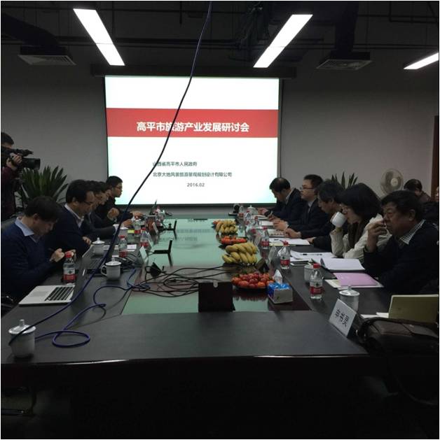 2016年2月26日,山西省高平市市长邹树琦、市委副书记邓志蓉、市委宣传部部长、市政府党组成员牛晓明、市旅游文物局局长赵志敏、市规划中心主任申书灵等到访大地风景国际咨询集团并召开高平市旅游产业发展研讨会。大地风景首席科学家吴必虎教授、北京大地云游科技有限公司总经理王亚博、北京大地风景投资管理有限公司总经理吴朝阳、北京大地风景旅游景观规划设计有限公司事业一部项目总监于健、北京大地风景旅游景观规划设计有限公司合伙人赵俊峰等参与研讨会。