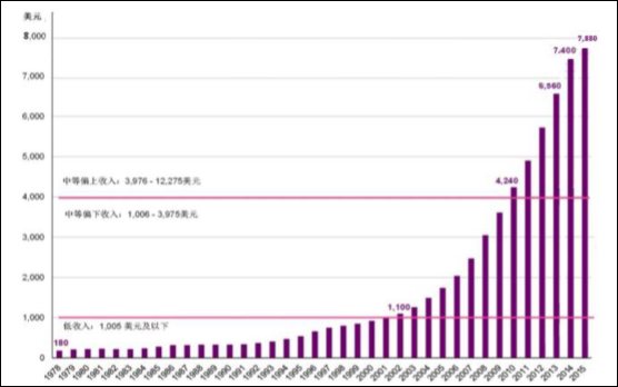 目前我们预测十九大党的工作方针是要全面提高人民的幸福指数,旅游是重要的一个影响人民幸福指数的业态。在旅游驱动城镇化的过程当中,第三产业的比重是一个非常重要的指标,可以看到我们山西晋源区整个第三产业的比重也是在逐步增加的,服务业成为城镇化主要驱动力的动力在哪里?是收入。根据世界银行统计,中国2015年人均国民总值达到了7880美元,国际上有一个公认的经验参数,即国民收入超过6000美金就会产生休闲度假需求。中国中等家庭平均收入,2015年比2013年增加了20%,中国中产阶级的崛起带动人均可支配收入递增,但是增长却并不均衡。