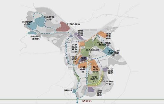 池北区始终坚持“生产空间集约高效、生活空间宜居适度、生态空间山清水秀”的发展理念,因此,我们采用城乡一体化发展的新型城镇化模式,为实现“让森林走进城市,让绿脉连接发展,让人类融入自然”的特色城镇化目标,先后组织召开国际国内的10余次大型规划设计会,相继完成了池北区“一心两核,两轴双园,五岸九区”的城镇功能格局。