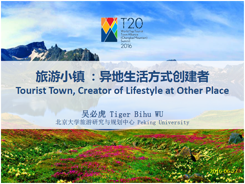 2016年6月25-28日,T20世界旅游名镇联盟(长白山)峰会在吉林省长白山二道白河镇召开。来自世界14个国家的20个小镇齐聚一堂,共商旅游发展大计。本次峰会由吉林省人民政府和国际旅游学会主办,吉林省旅游局和长白山管委会承办,大地风景国际咨询集团协办。6月27日,北京大学旅游研究与规划中心主任吴必虎教授受邀做了主题演讲。以下是演讲内容整理:
