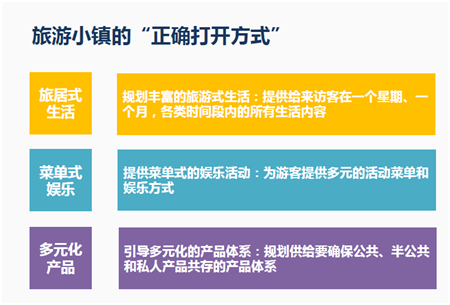那么,旅游小镇正确的打开方式是什么?首先,游客要享受到一种旅居式的生活,提供给他各类时间段内的所有生活内容;其次,旅游小镇能够给游客提供持续性的、菜单式的娱乐活动。最后,游客可以有很多种选择,可以选择不同的地方,因此,产品就要有多元化的构成。