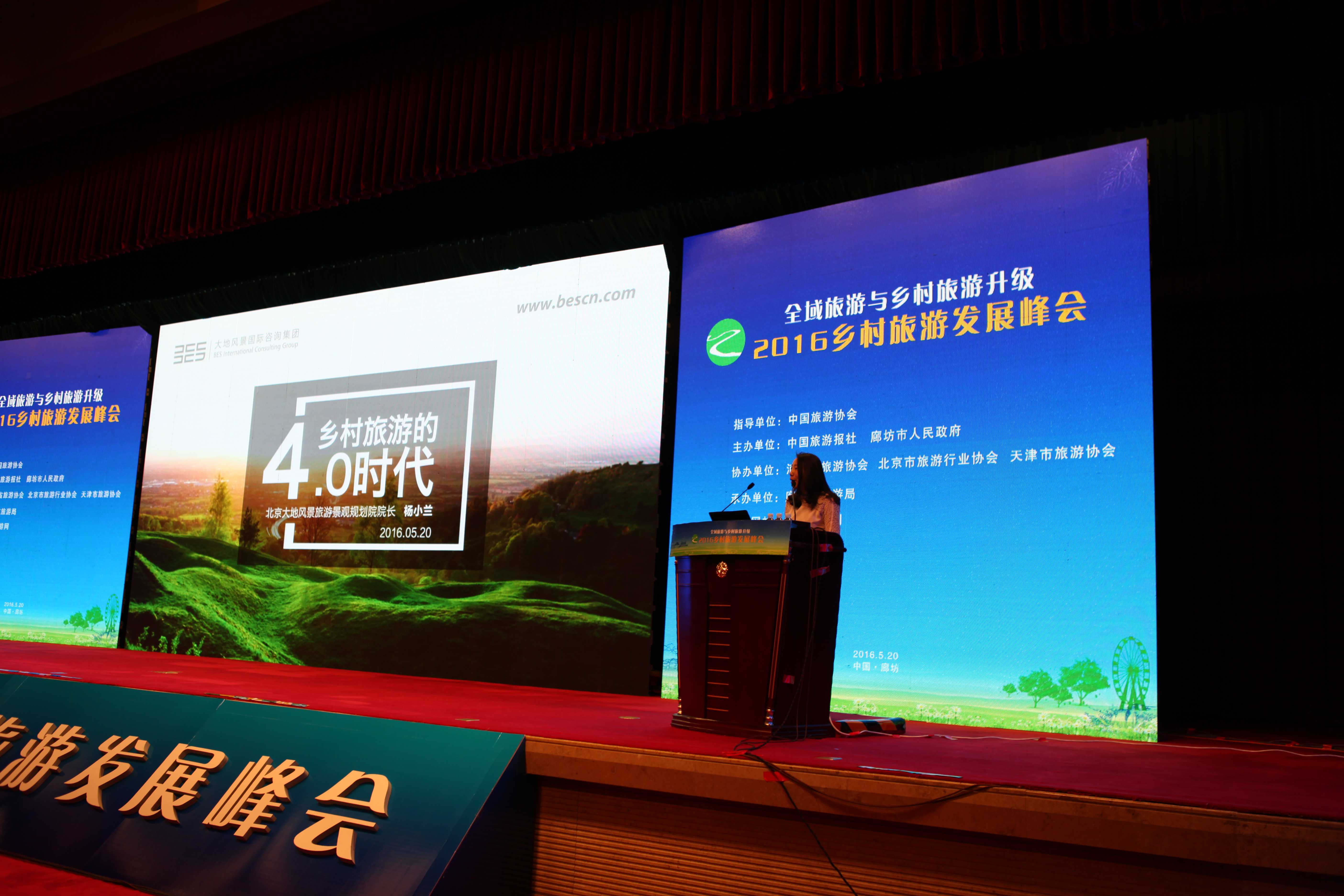2016年5月19日,首届世界旅游发展大会在北京举行,与此同时由中国旅游报社、廊坊市人民政府主办的“首届中国乡村旅游发展峰会”在河北省廊坊市举办,探讨中国乡村旅游发展问题。大地风景国际咨询集团副总裁杨小兰女士应邀本次峰会并演讲。