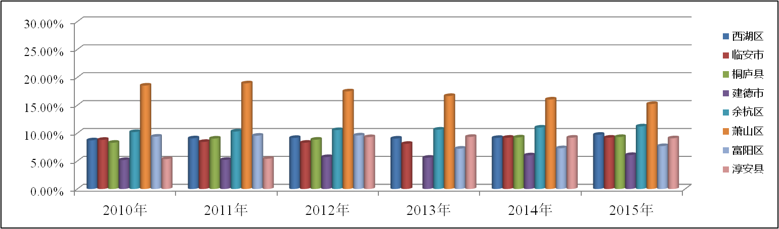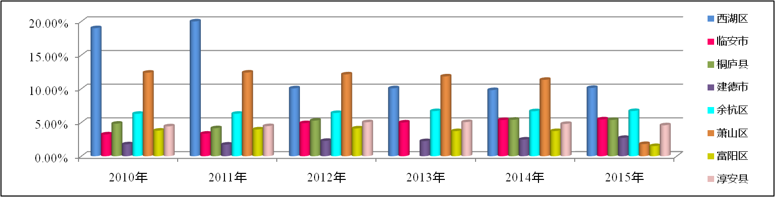 图4:2010~2015年杭州市各地区旅游接待量占有率分析图